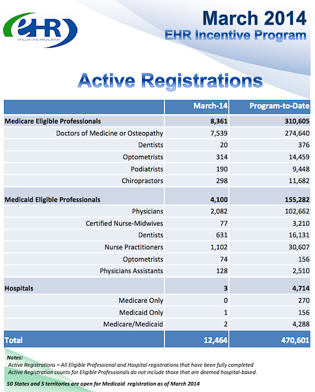 Notice the aggregated registrant counts for 2011 and 2012, after which they only give monthly registrations for 2013. Hmmm... 123,648 Medicare EPs in 2011, and 113,658 in 2012, for example. Maybe they just don't want you to easily see the dramatic fall-off in 2013 registrants. There were only 54,062 Medicare docs registered for MU in 2013, less than half, relative to 2012.